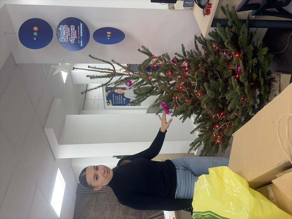An indoor scene within an MMA insurance agency, specifically identified by prominent French signage for "MMA" and promotional offers in French ("2 mois offerts EN 2025 + 1 mois offert EN 2026 sur vos contrats Auto et Habitation"), consistent with a branch office in Cagnes-sur-Mer, France. A young adult female, with dark hair pulled back and wearing a black turtleneck and light blue jeans, stands on the left side of the frame. Her left hand is extended, touching a pink feathery ornament on a real evergreen Christmas tree. She looks directly towards the camera with a neutral expression. The Christmas tree is decorated with red string lights, various pink baubles, and a white star tree topper, resting on a wooden base. In the background, white walls and a white suspended ceiling with fluorescent light panels are visible. Three circular blue MMA signs are vertically arranged on the right wall, with the central sign displaying the aforementioned promotional text. A larger poster featuring a woman and French text related to retirement ("MMA POUR AVENIR Et si c'était le bon moment pour parler de votre retraite ?") is visible further back. A light-colored office desk is present on the right, with two small red gift-like objects placed on it. In the lower-left foreground, a yellow plastic bag and an open brown cardboard box are partially visible.