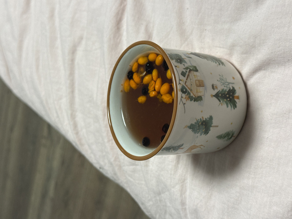 A ceramic mug filled with a brown liquid and numerous small orange and black berries rests on a white, textured surface. The mug features a tan rim and illustrations of wintery scenes, including a cabin, Christmas trees, and reindeer. The backdrop appears to be a wrinkled sheet, with the edge of a floor visible on the left. The lighting is soft and diffused.