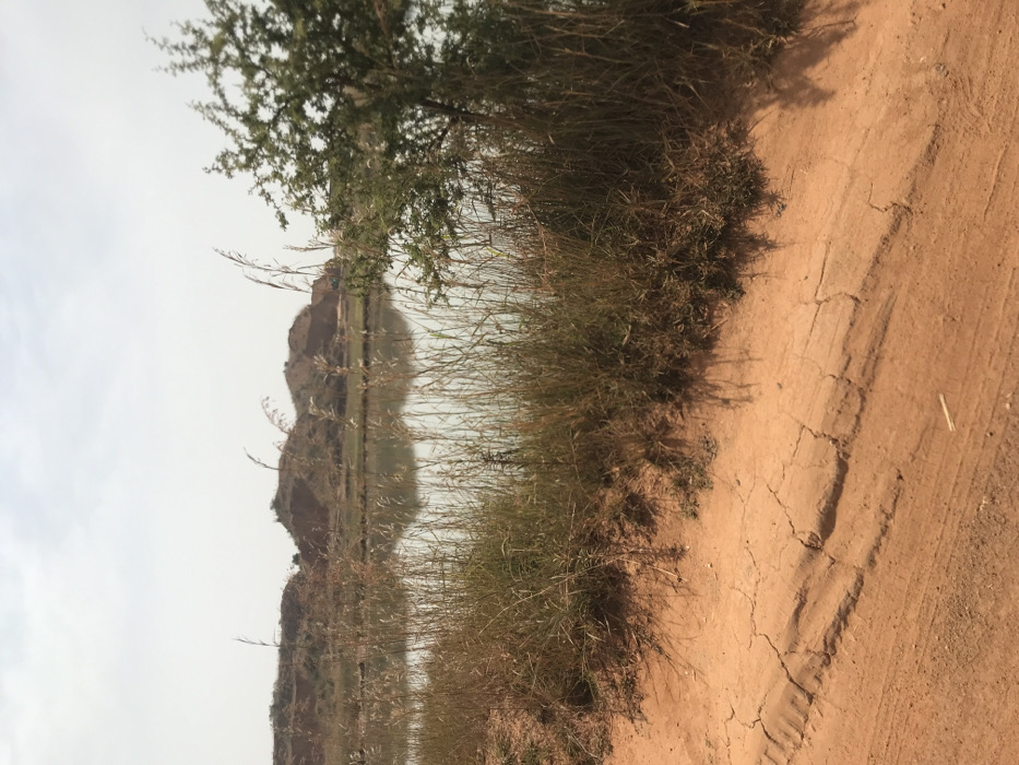 The image depicts an outdoor scene in Rayfield, Nigeria, characterized by a natural landscape. The foreground features a reddish-brown dirt path or road exhibiting numerous cracks and undulating patterns, possibly tire tracks or erosion marks. Adjacent to this path, a dense strip of dry, tall, yellowish-green grasses and reeds grows along the bank of a still body of water. A small, leafy green shrub is visible on the far right, partially obscured by the foreground vegetation. The water surface is calm, reflecting the light greyish-white sky and distant earthen formations. In the background, beyond the water, a series of uneven, reddish-brown earthen mounds or low hills rise, suggesting disturbed ground or natural topography. The sky above is a uniform light greyish-white, indicating an overcast or hazy condition. No people, animals, or active human interactions are present within the frame. The overall environment appears dry and somewhat desolate.