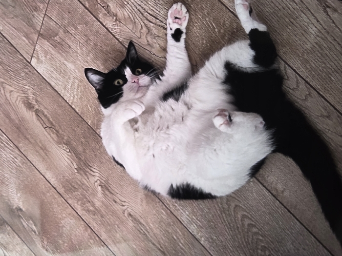 - "A domestic bicolored cat, exhibiting black and white markings typical of a tuxedo pattern, is depicted lying supine on a light brown wooden laminate floor" by FM-bPPv32, licensed under CC BY 4.0