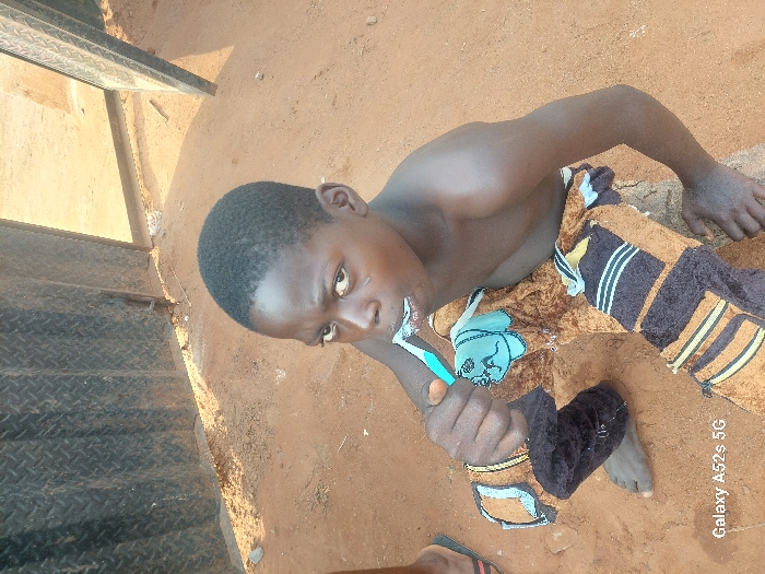 A shirtless young person outdoors, possibly in a yard, holds a blue toothbrush with toothpaste on it