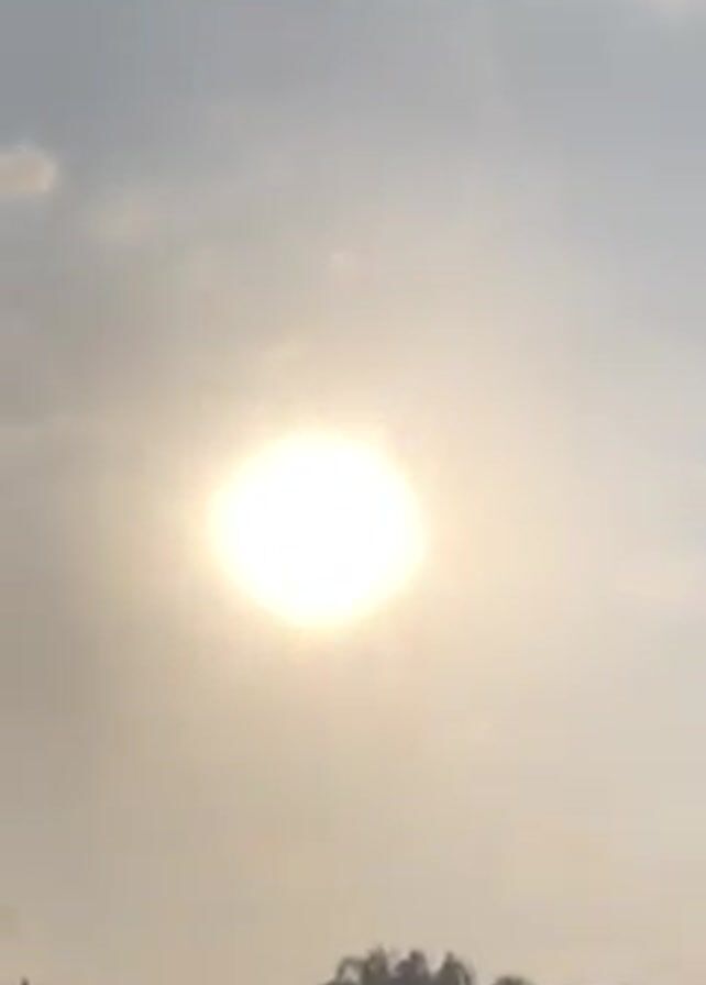 bright sun in a sky with a few scattered clouds. The sun is obscured by a slight haze. Below the sky is a line of silhouetted trees. The camera pans slightly upward revealing the edge of a roof in the foreground.