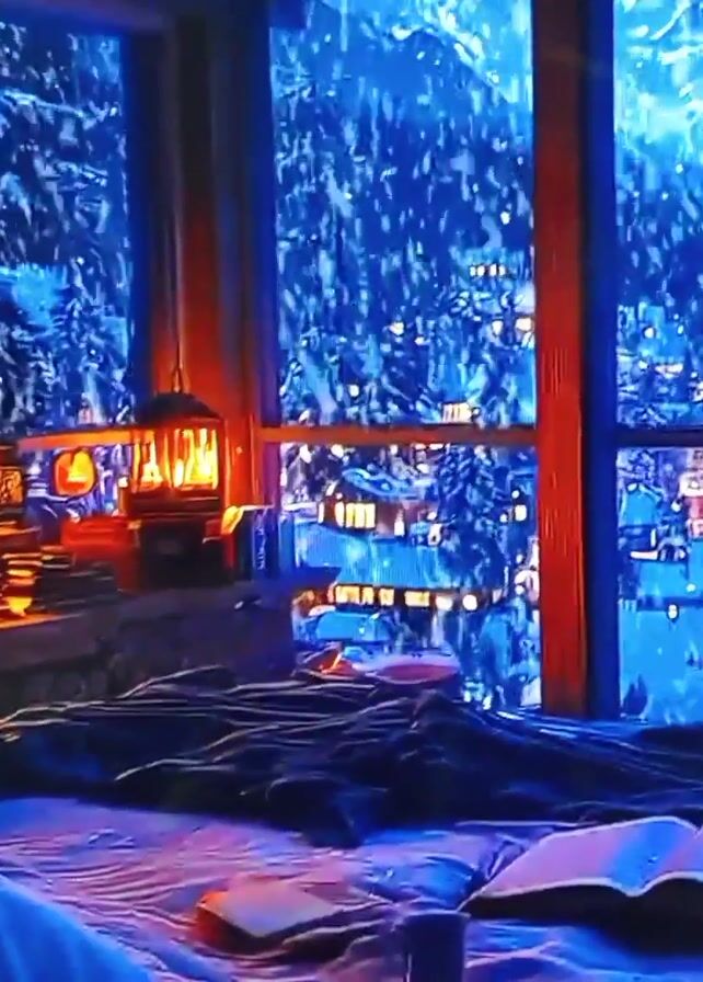 cozy room with a fireplace and a large window. The fireplace has burning logs, and there are books and candles on the mantel. The window looks out onto a snow-covered village nestled in the mountains. A bed with a book lying open on it is in the foreground. The room is dimly lit, creating a warm and inviting atmosphere.