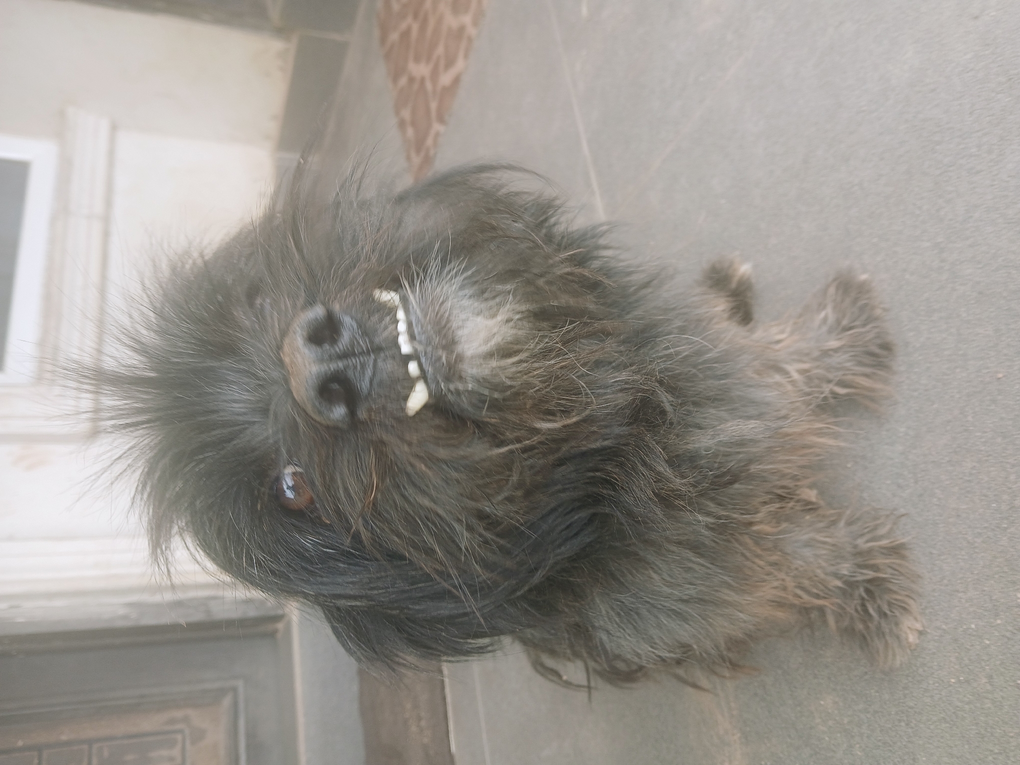 A medium-sized, shaggy, black dog lies on a grey paved surface. The dog is facing upwards with its mouth slightly open, revealing its teeth. The background includes a door on the left and a patterned tile wall above the dog. This image was taken in Kitwe, Zambia.