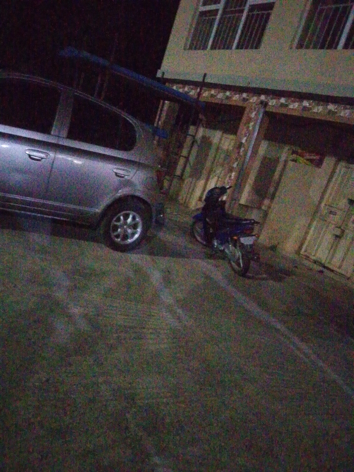 This image depicts an outdoor scene at night in Zango-ndaji, Nigeria. A silver or light grey hatchback vehicle is parked on a paved surface on the left side of the frame, viewed from its rear-left quarter, displaying a multi-spoke wheel. To the right and slightly behind the car, a dark blue motorcycle is parked, facing right. In the background, a two-story building with a light-colored facade is visible. The upper floor features multiple windows with visible security bars, while the ground floor has several closed doors or entrances. A dark blue tarp structure is positioned above the car, seemingly attached to the building, and a ladder leans against the building's exterior. The ground shows subtle patterns of light, suggesting artificial illumination in low-light conditions, contributing to the grainy image quality. No individuals are present in the scene.