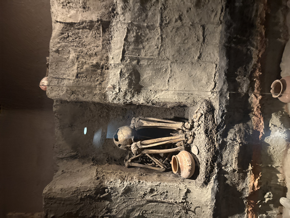 A skeleton rests in a carved-out rock space. The skull is visible with leg bones crossed over others. A pottery jug sits near the skeleton's feet. Another pottery jug is partially seen on the upper right. The rock around the skeleton appears rough-hewn and dimly lit, suggesting a tomb or burial site. A small light shines above the skeleton.