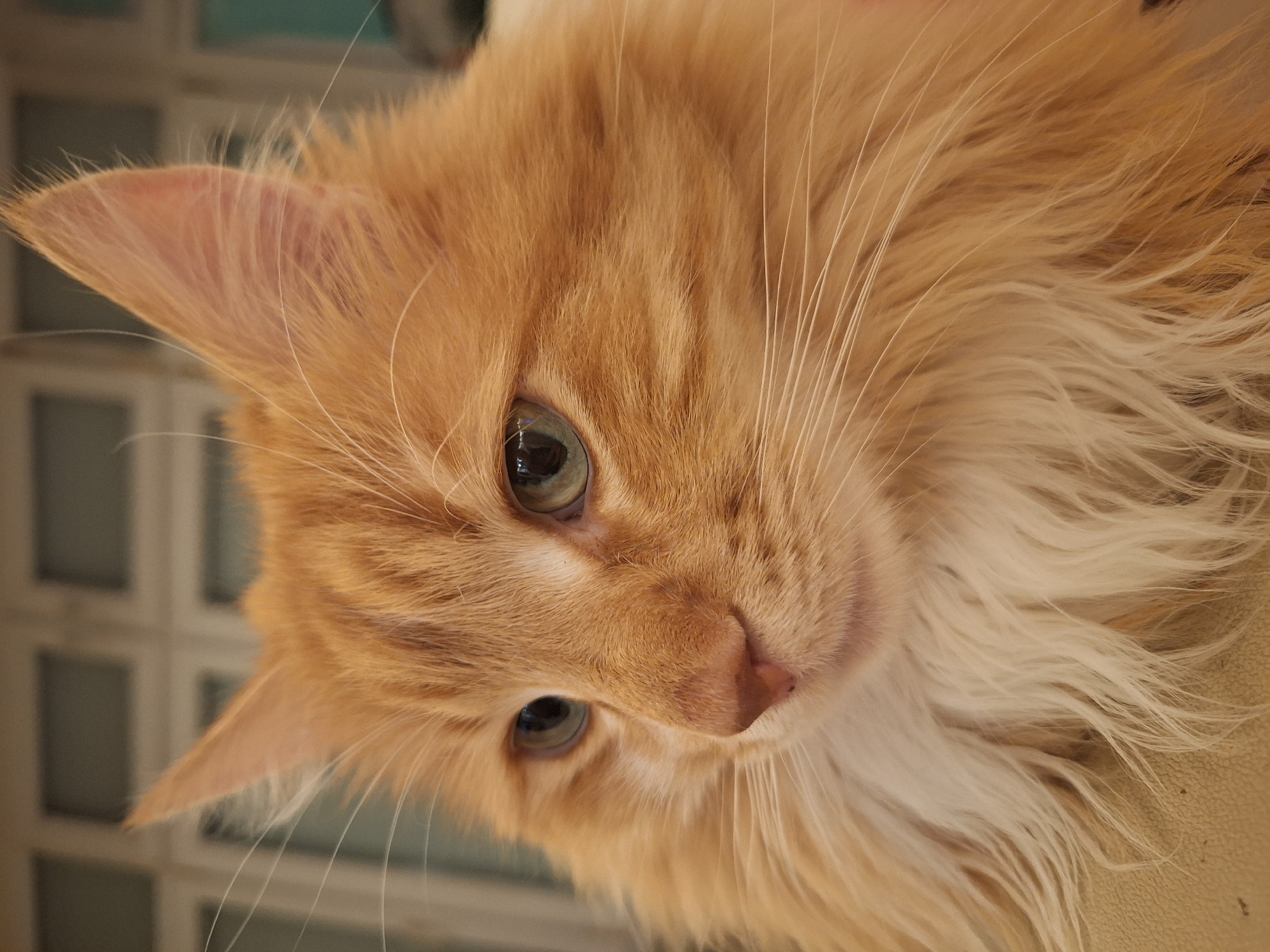 - "A close-up, indoor shot depicts an orange tabby cat with green eyes" by FM-rIr6y1, licensed under CC BY 4.0