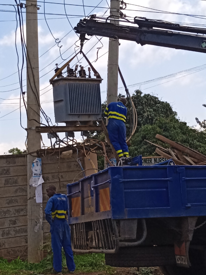 In Embu, Kenya, an outdoor utility scene depicts the suspension of a large, grey electrical transformer by a dark-colored hydraulic crane arm