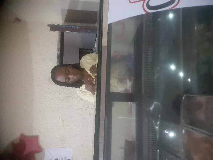 A woman wearing a yellow dress is seen behind a window with a dark frame. The window appears to be part of a food or bakery display case, with metallic shelves partially visible. There is a wall with a small window in the background and a pink star-shaped decoration in the bottom left corner of the image. The woman is facing down and appears to be eating or working with something. The picture is a bit blurry.