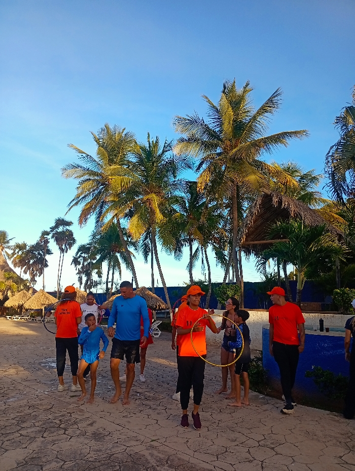 The image depicts an outdoor scene in Playa El Agua, Venezuela, under a clear blue sky. A group of approximately ten individuals is present on a patterned stone-paved surface, surrounded by numerous tall palm trees. In the background, multiple thatched-roof structures, consistent with palapas or churuatas, are visible. The sun casts a golden light on the palm fronds. Six individuals are distinctly visible in the foreground and midground. Three adults are wearing matching orange t-shirts and orange caps. One adult on the far left, partially visible, wears an orange t-shirt with "TEAM MARACANA" written on the back and holds a hula hoop. Another adult in an orange t-shirt and cap is centrally located, holding a yellow hula hoop in front of them with both hands. A third adult in an orange t-shirt and cap walks on the far right. One adult male is in a long-sleeved blue shirt and dark shorts, walking barefoot. Two children are present: one barefoot child in a blue swimsuit walks near the center-left, and another child in dark clothing holds a blue hula hoop near the center-right. An adult female with dark hair, wearing a dark top and denim shorts, stands barefoot to the right of the central figure. The group appears to be in motion, generally moving from left to right across the frame. A low blue wall or structure is visible on the far right. No specific interactions or actions beyond walking and holding hula hoops are clearly discernible.