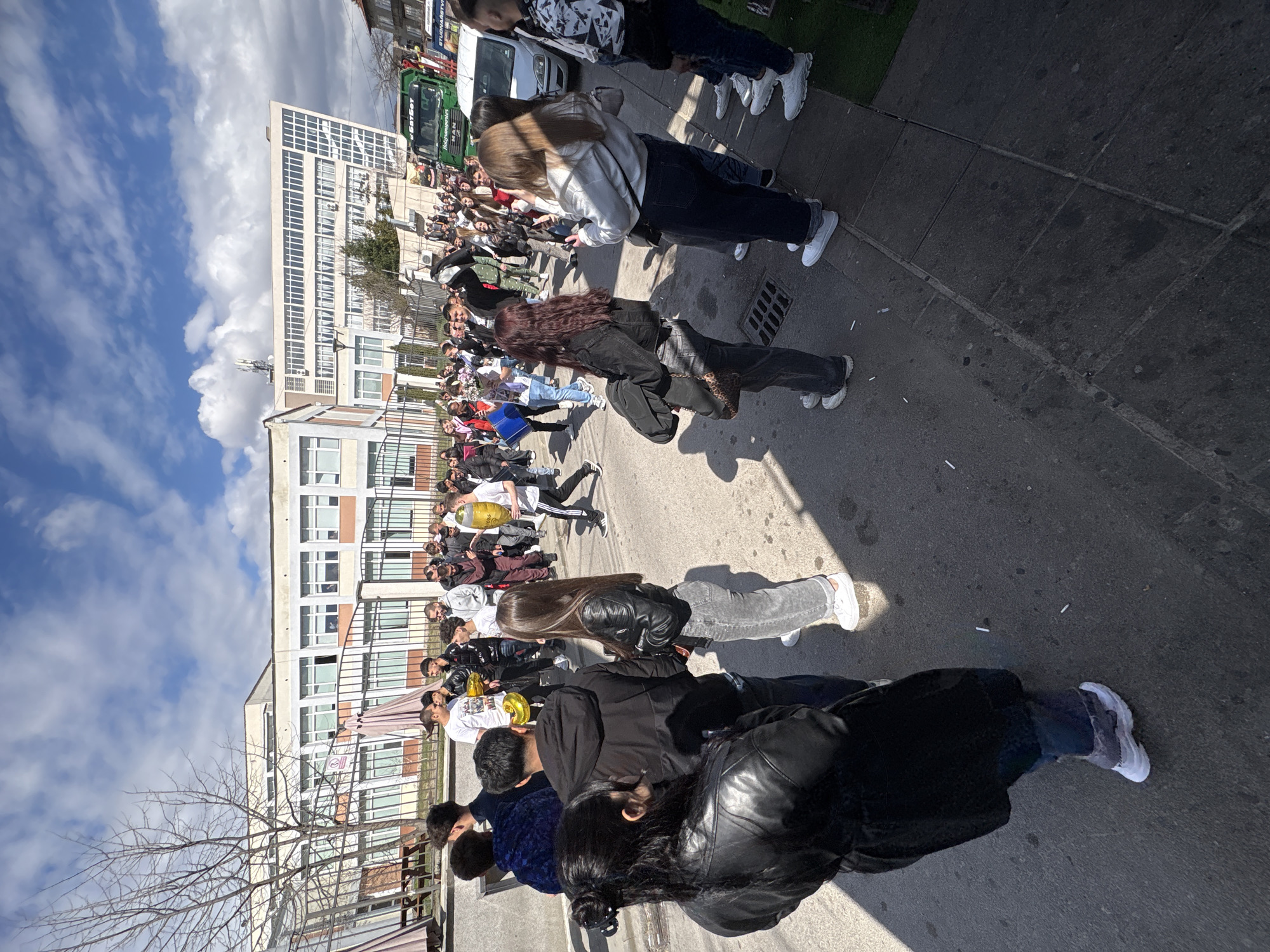 The image captures an outdoor gathering of approximately 50 to 70 young individuals, predominantly teenagers and young adults, on a sunny day in Goce Delchev, Bulgaria. The group is situated on a paved surface consisting of asphalt and concrete slabs, with strong shadows cast across the ground. Scattered white cigarette butts are visible on the asphalt in the foreground. Individuals are dressed in casual attire, including jeans, sneakers, t-shirts, and various jackets, notably several black leather jackets. Many are standing, some are engaged in conversation, and a few are holding mobile phones, seemingly documenting the scene. Several participants hold gold-colored celebratory balloons, including at least one shaped like a beer mug and others appearing to be numbers. One person is visible holding a bouquet of flowers. In the background, two multi-story buildings are prominent. The building on the right features a light-colored facade with numerous windows, some of which are angled, and appears to be a modern institutional or commercial structure. To its left, another building with a more traditional appearance is partially obscured by bare tree branches. A metal fence separates the gathered crowd from the buildings. Near the left building, several closed, light-colored outdoor umbrellas are visible. On the far right of the scene, a large green "MAN" brand truck is parked, displaying the Cyrillic text "ПЪТЕБОТ" (PUTEBOT) and "Hatebonpenia" (as spelled) on its side. A white van is partially visible next to the truck. The sky above is blue with scattered white cumulus clouds. The environment suggests an urban setting, likely a public street or plaza adjacent to a school or administrative building in the city of Goce Delchev.