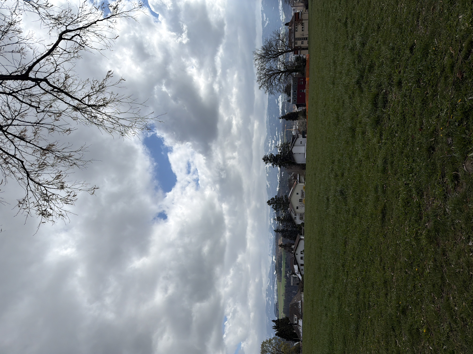 The image presents an outdoor landscape view, likely captured from an elevated position within or near Fribourg - Freiburg, Switzerland. The lower half of the frame is dominated by an expanse of unmaintained green grass, exhibiting varying lengths and occasional yellow vegetative elements. Across the midground, a residential area is visible, featuring a cluster of detached and semi-detached houses of varying architectural styles and colors, including a prominent red-painted building with dark window frames situated behind an orange safety barrier or fence. These structures are interspersed with numerous trees, some appearing as bare deciduous specimens and others as dark green conifers. Beyond the residential zone, rolling hills lead to a distant mountain range, partially covered in snow, extending across the horizon. The upper half of the frame features a dynamic sky filled with large, textured grey and white cumulus clouds, punctuated by several clear patches of blue sky. From the top right quadrant, a bare tree branch, characterized by fine twigs and a few small, dried seed pods or leaves, extends diagonally into the frame, silhouetted against the bright sky. No human figures or discernible activities are present within the scene.