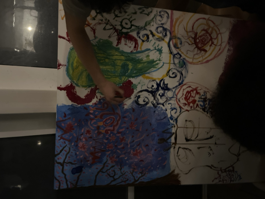 A person paints on a large canvas. The artwork features distinct sections. The top left has a blurry, greenish area, surrounded by red and black markings. Spirals and swirling patterns in navy, yellow, and red occupy the top right and center. The lower left displays a blue wash with tree branches and pink blossoms. A sketch of a face with prominent eyes and lips is on the right.