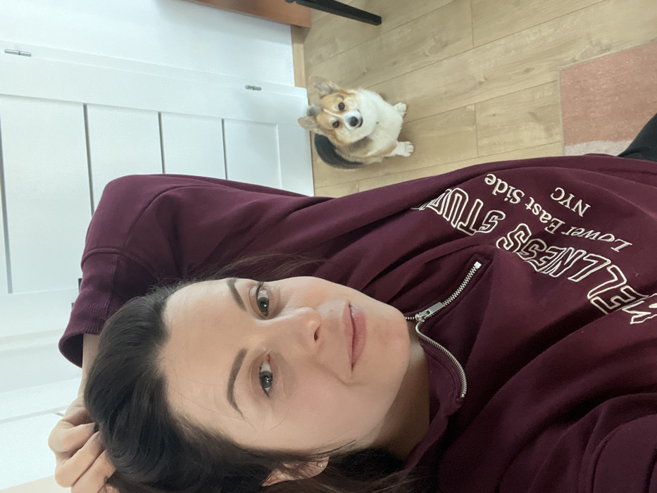 The scene is an indoor domestic environment, located in Gangloff, Germany. A female subject occupies the left and central portion of the frame, appearing to take a selfie. She has dark hair, which she is holding with her right hand near the top of her head. She wears a maroon quarter-zip sweatshirt featuring a silver zipper and white text that reads "WELLNESS STUDIO Lower East Side NYC". Her face is directed towards the camera with a faint smile. To the right of the female, a Pembroke Welsh Corgi dog is seated on a light-colored wooden floor, also facing the camera with an alert, open-mouthed expression. The dog exhibits tan, white, and black fur and wears a thin white collar. The background features a white door with three horizontal panels. A small, reddish-brown rectangular mat is visible on the floor in the lower right, and a dark furniture leg is partially visible in the upper right.