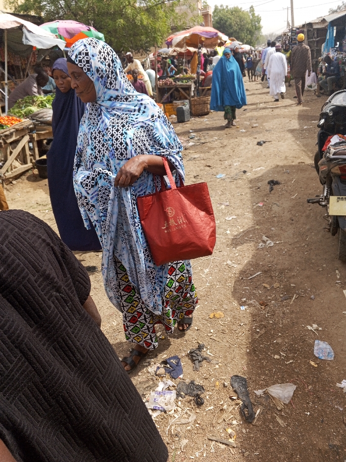 The image depicts a crowded outdoor street market in Gama, Nigeria, on a bright day. In the immediate foreground, the back and left shoulder of a person wearing a textured black garment are partially visible on the left. The central subject is a woman with dark skin, appearing to be middle-aged or older, positioned slightly to the left of the frame's center. She wears a light blue and white patterned hijab and an underlying long dress with a colorful geometric pattern primarily featuring red, green, and black designs on a light background. She wears dark sandals. Her right hand holds a red tote bag with a gold circular logo displaying "WULANQIFEI" and Chinese characters. Her left hand is extended, gripping a fold of her garment. Her gaze is directed towards the left. Behind her, another woman in a dark blue hijab and garment is partially visible. The ground is a dusty, uneven dirt path, littered with various items of refuse including plastic bags, wrappers, and dark debris. To the right of the central woman, a black motorcycle is partially visible, parked on the dirt. A yellow object resembling a license plate is discernible near its rear wheel. In the midground and background, the street market extends into the distance. Numerous individuals are present, walking and congregating. Market stalls are set up along both sides of the path, featuring wooden structures and colorful awnings or umbrellas, predominantly orange and light blue. Various produce, including green leafy vegetables and red tomatoes, are displayed on wooden tables and crates. A woman in a bright blue burqa walks away from the camera in the middle ground. Further down the path, several men in white thobes and light-colored head coverings are visible. Buildings with light-colored facades and green trees are visible in the background under a clear sky.