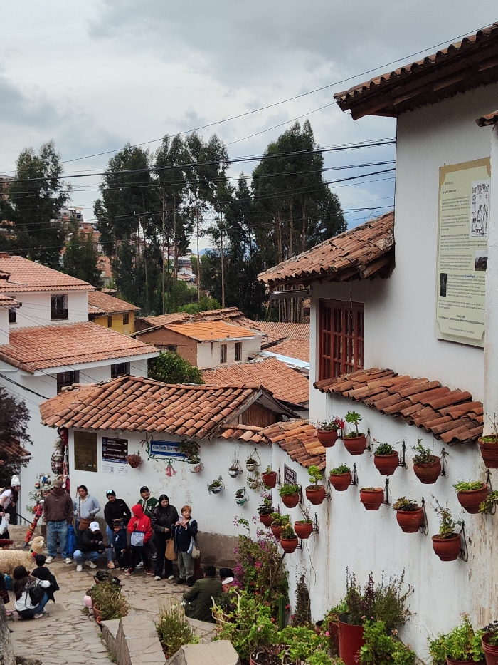 A hillside street scene showcases terracotta-tiled roofs of whitewashed buildings under a cloudy sky. A group of people are gathered along the stone path, some interacting with a sheep. The walls are adorned with hanging plants in clay pots, creating a vibrant contrast to the architecture. Tall trees are visible in the background, adding depth to the composition.