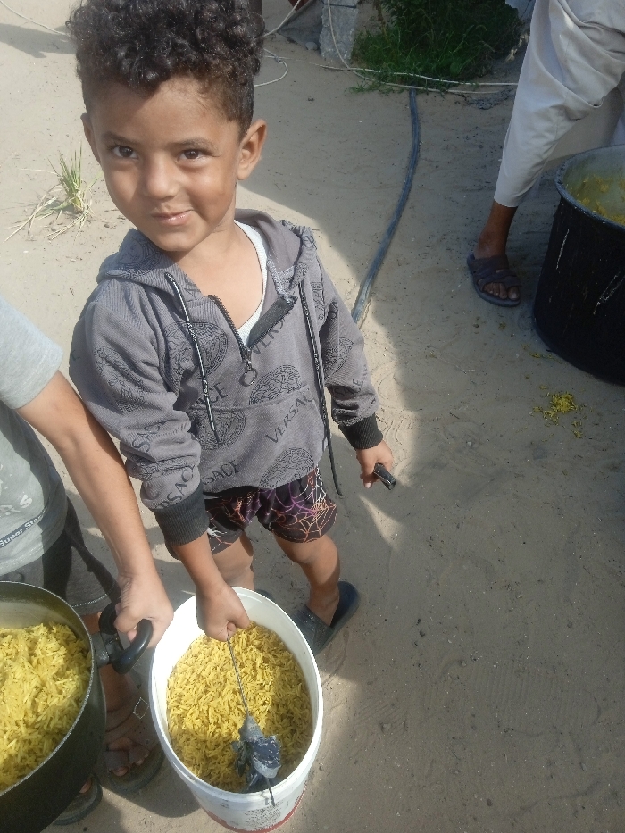 - "An outdoor scene in Al-Mawasi depicts a young boy and two partially visible adults engaged with large quantities of yellow food, likely rice" by FM-cV3b62, licensed under CC BY 4.0