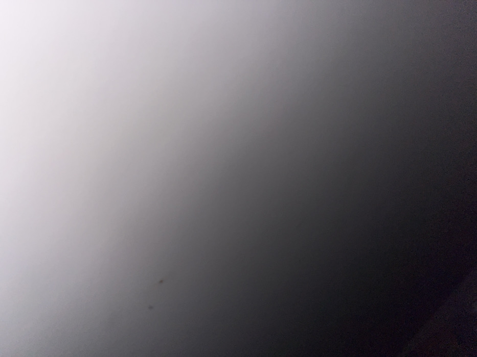 The image displays a smooth, diagonal luminance gradient, transitioning from a bright, near-white tone in the upper-right corner to a dark, near-black tone in the lower-left corner. Two small, irregular, dark specks are faintly visible in the upper-left quadrant of the frame. No discernible subjects, objects, people, actions, interactions, or specific environmental features are present. The visual content lacks any identifiable landmarks, architectural details, or unique characteristics that would permit determination of a specific location within Sofia, Bulgaria. The scene is devoid of contextual information.