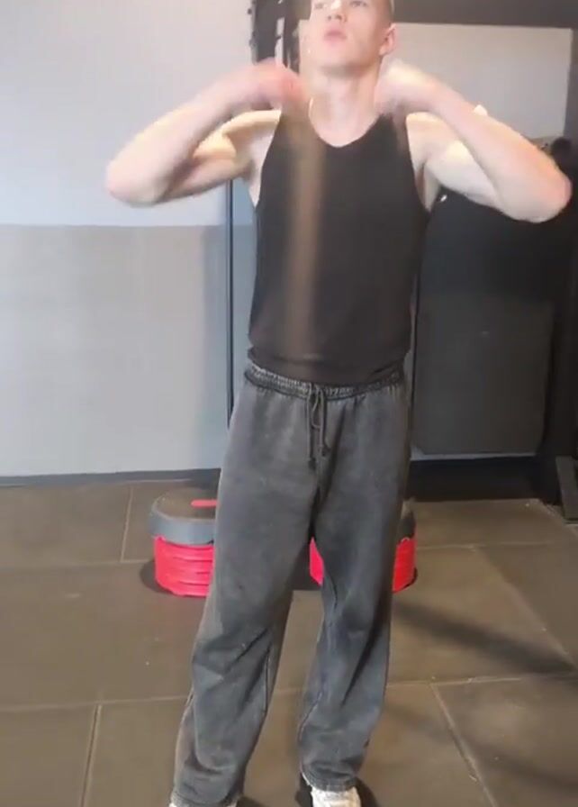 A young man is in a gym doing arm stretches. He wears a black tank top, gray sweatpants, and white sneakers. The gym has a black weight rack, a red and black step platform, and tile flooring. The man begins by moving his arms in small circles, then extends them outward. The camera moves to the right during the video.