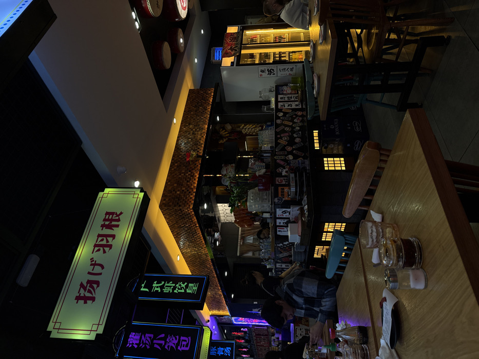 The image depicts the interior of Agagehane restaurant, located at Plaza de los Mostenses, 1, 28015 Madrid, Spain. The scene captures a section of a dimly lit, modern Asian restaurant with prominent neon signage and warm accent lighting. In the foreground, a light-colored wooden table is visible on the left, featuring a salt shaker, a red chili flake shaker, two clear glasses, and two condiment bottles (one dark, one red-capped). To the left of the table, a male individual with dark hair, wearing a black and white plaid shirt, is seated, looking downwards at an object out of frame. A light blue chair is partially visible next to him. A central counter or bar area extends across the midground. Its lower section is adorned with illuminated window-like panels. The counter surface holds various items including bottles, a Maneki-neko figurine, and decorative stickers. Two individuals, appearing to be staff members, are partially visible behind the counter. Above the counter, a ceiling section with a textured, wooden-like finish emits a warm yellow light. Hanging from the dark ceiling, three illuminated signs are prominent: a large, horizontal, light yellow sign with red characters reading "扬げ羽根", and two vertical blue neon signs to its left reading "灌汤小笼包" and "广式虾饺皇" respectively. In the background, to the right of the counter, a tall, white commercial refrigerator with glass doors displays numerous beverages, illuminated with an internal warm light. A male individual with light-colored hair is seated at a table to the far right, partially obscured. Above this area, red, drum-shaped decorative elements are mounted on the ceiling. The floor is covered in dark tiles.