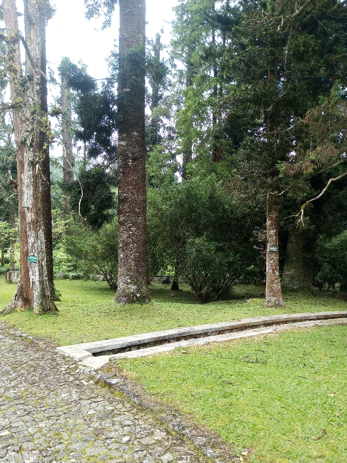 The image displays an unoccupied outdoor scene within the city of Pachmarhi, India, under overcast conditions. The foreground features a cobblestone path, partially covered in moss, originating from the lower left and extending towards the center. This path is bordered by a straight, open concrete drainage channel, which in turn separates it from a meticulously maintained grassy lawn occupying the lower-right and mid-ground. Several tall, mature tree trunks with rough, dark bark dominate the mid-ground; a small, rectangular green sign is affixed to the leftmost trunk. Numerous dense, green bushy shrubs are scattered across the grassy areas between the trees. The background consists of a dense forest composed of additional tall trees and thick green foliage. No individuals, animals, or active events are present within the frame.