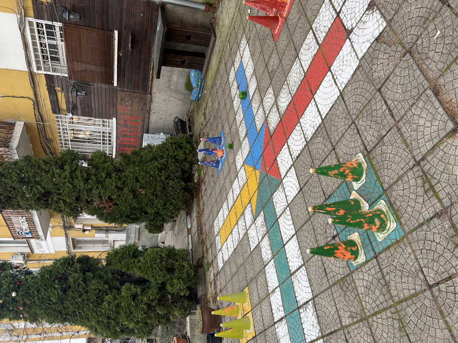 The image displays an outdoor Ludo game painted on grey square paving stones in a courtyard at ulitsa Georgi Benkovski 12, Sofia, Bulgaria