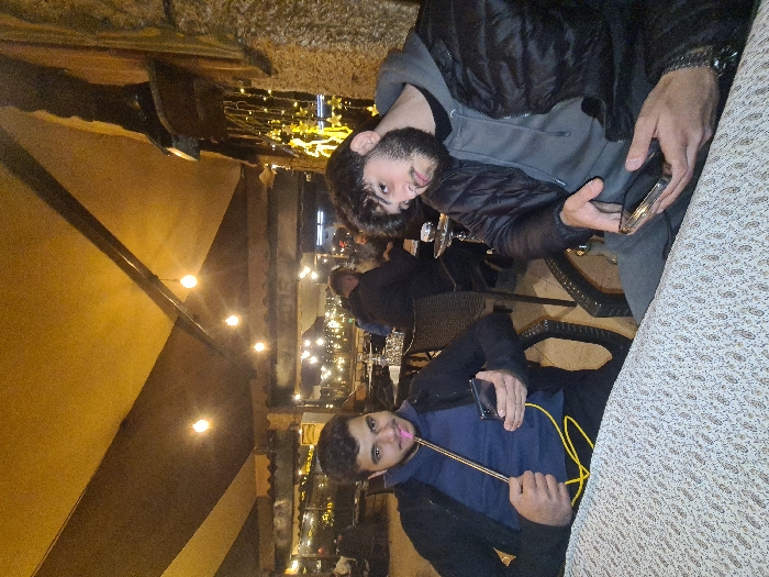 Two men sit at a table in a warmly lit indoor setting. One man, partially visible, holds a phone and wears a puffy black jacket over a grey hoodie. The other man holds a hookah hose, with a phone resting on the table next to him, clad in a navy shirt and dark jacket. Lights twinkle in the background.