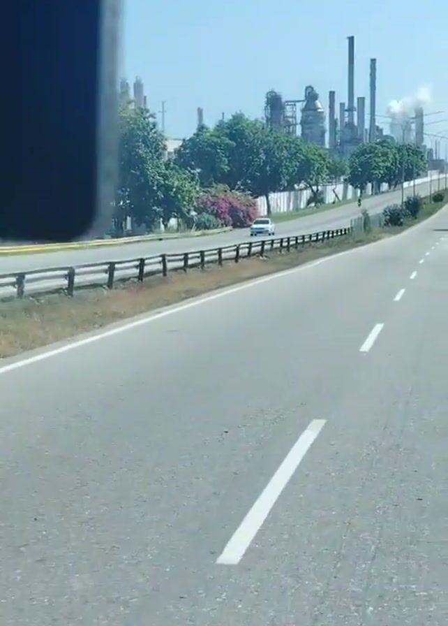 drive on a two-lane road on a sunny day. In the distance, a large industrial complex with multiple smokestacks and structures is visible. The road has white lane markings and a metal guardrail separates the road from a grassy area and trees lining the complex. A few cars can be seen driving on the road in the distance. The sky is clear blue with a few white clouds. The video is likely taken from inside a moving vehicle.