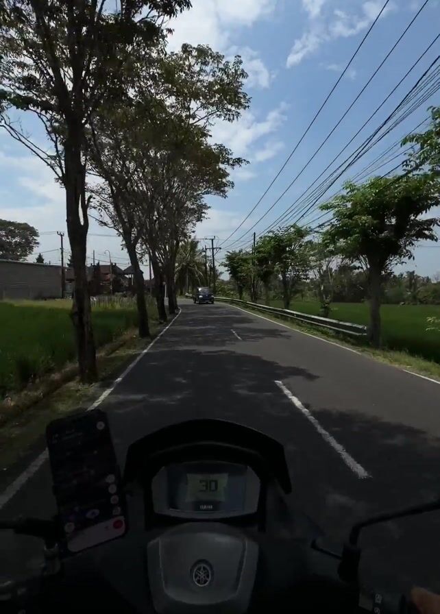 first-person perspective from a person riding a Yamaha motorcycle on a paved road. The speedometer reads 30. The road is lined with trees and rice paddies on either side. Power lines run above the road. The sky is blue with scattered clouds. A smartphone is mounted on the motorcycle's handlebars, displaying a map. A dark-colored truck passes in the opposite direction.