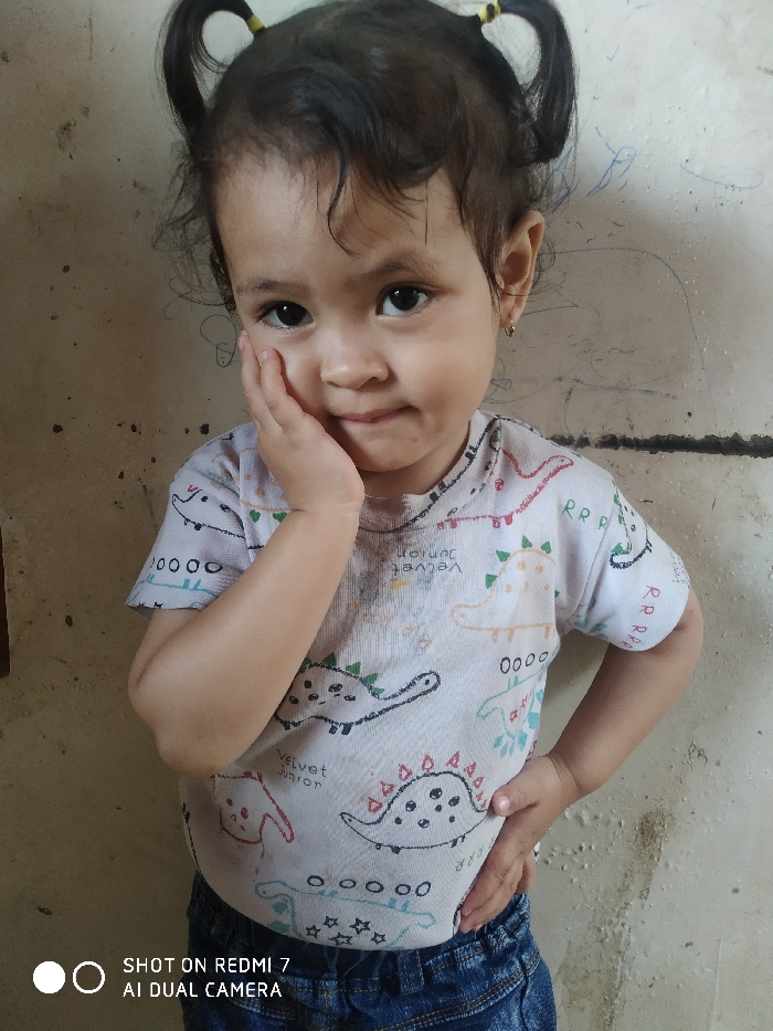 A young child poses for a photo. The child has dark hair styled in two pigtails with yellow hair ties. They are wearing a patterned shirt with dinosaurs and the words "Velvet Junior" on it. They are also wearing blue jeans. The child has one hand on their cheek and the other on their hip. The background appears to be a wall with some markings. The bottom of the image includes a camera watermark.