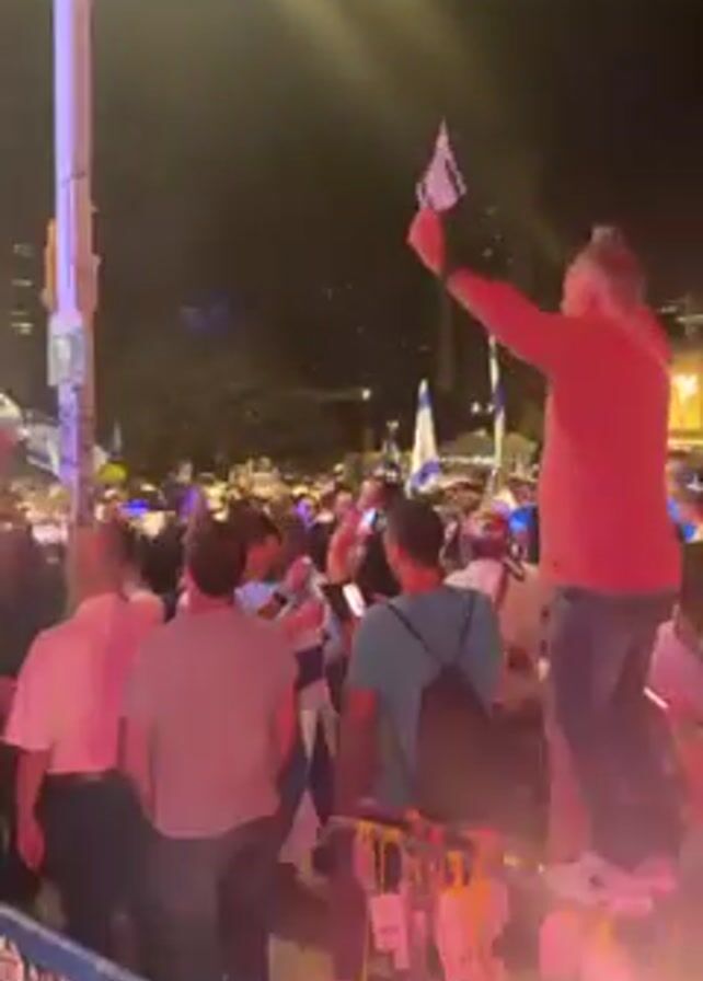 At night, a crowd of people stand closely together on the ground. In front of them a man stands atop a gray metal barricade, holding a small flag in his right hand. To his left a tall street light shines brightly. Other people in the crowd also hold flags. Many are taking photos with their phones. The video ends with a red flash covering the scene.