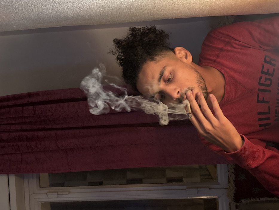 A man with curly black hair, wearing a red "Tommy Hilfiger" sweatshirt, lies down next to a window with a burgundy curtain. He holds a lit cigarette or joint between his lips and fingers. Smoke rises and curls in the air above him and the curtain. The scene is lit from above, casting shadows on the wall and ceiling behind him.