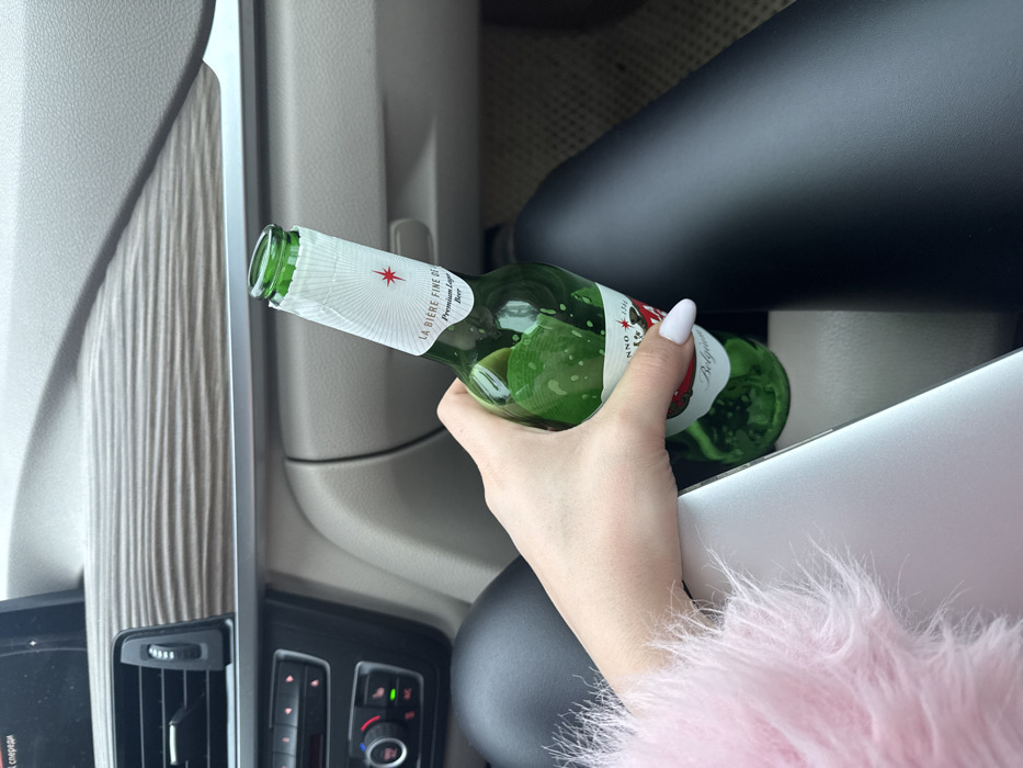 Inside a modern vehicle in Pushkino, Russia, a person occupies a seat, likely the front passenger side. The person's left hand, adorned with light-colored fingernail polish, grasps an open, partially consumed green glass bottle. The bottle's neck label displays "LA BIERE FINE DE...", "Premium Lager", "Beer", and a red star icon, with "Belgium" visible on another part of the label. The person's left forearm is covered by a fluffy, light pink garment, and their left leg is clad in dark, form-fitting trousers. A silver-colored laptop is partially visible beneath the hand, resting near the person's lap. The vehicle's dashboard features a light-colored surface with a horizontal, wavy-textured trim on the passenger side, alongside visible air vents and climate control components with red and blue indicators on the center console.