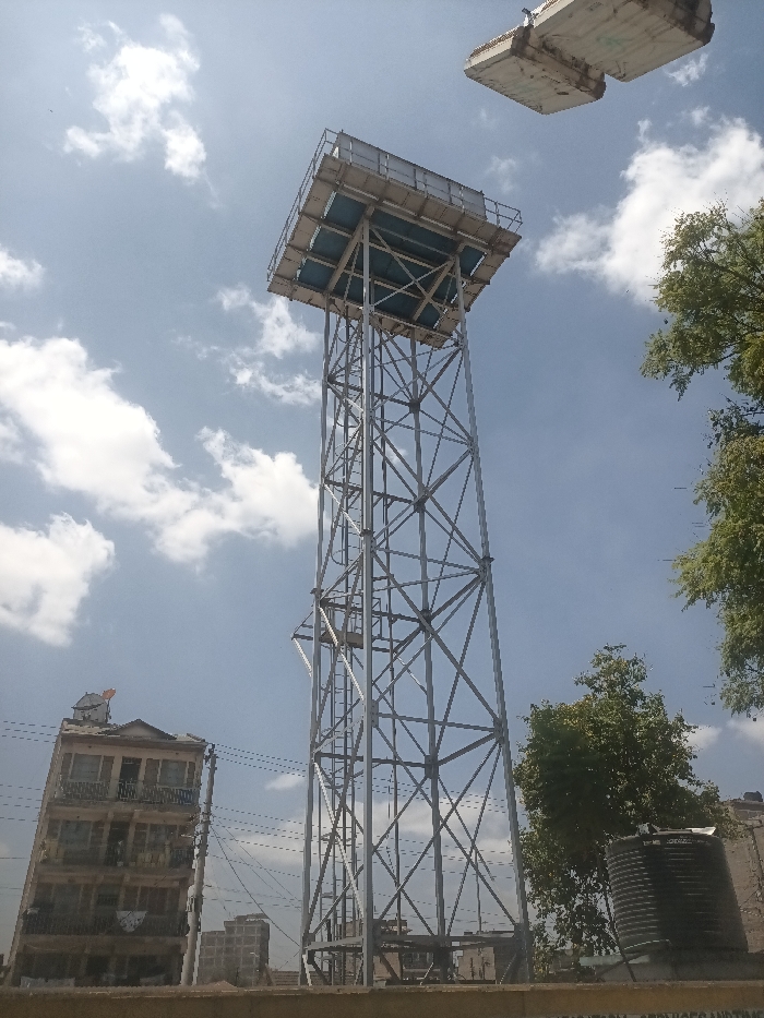 - "The image displays a tall, freestanding water tower constructed from a galvanized metallic lattice-frame structure, supporting a rectangular water tank enclosure at its apex" by FM-oBVoo1, licensed under CC BY 4.0