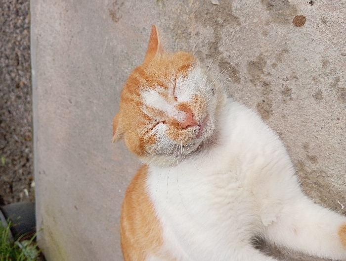 - "An orange and white cat lies on a concrete surface" by FM-TnUEx2, licensed under CC BY 4.0
