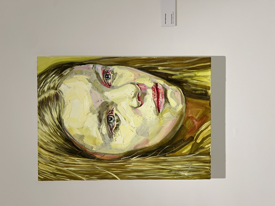 The scene displays an oil painting titled "The YouTube Girl" by artist Katya Udalova, mounted on a plain white wall in an exhibition space located in Rostov-on-Don, Russia