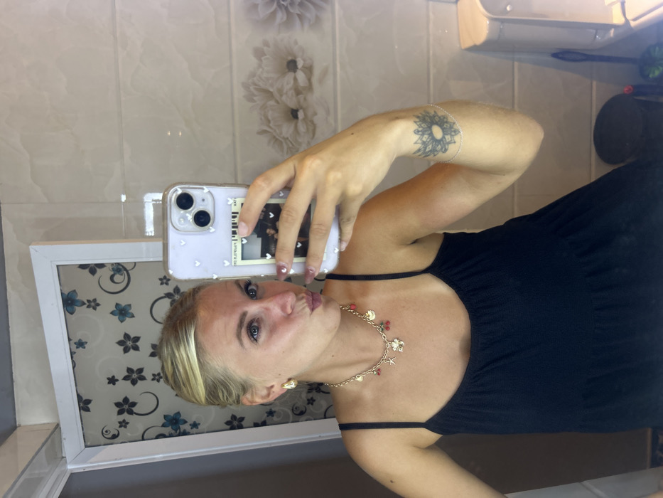 A fair-skinned woman with blonde hair pulled back is taking a selfie in front of a mirror. She wears a black spaghetti strap dress and a gold charm necklace. The phone case is decorated with hearts and a picture. The woman has a tattoo on her arm. The background includes patterned wall tiles, a framed mirror, and a glimpse of a bathroom countertop with toiletries.