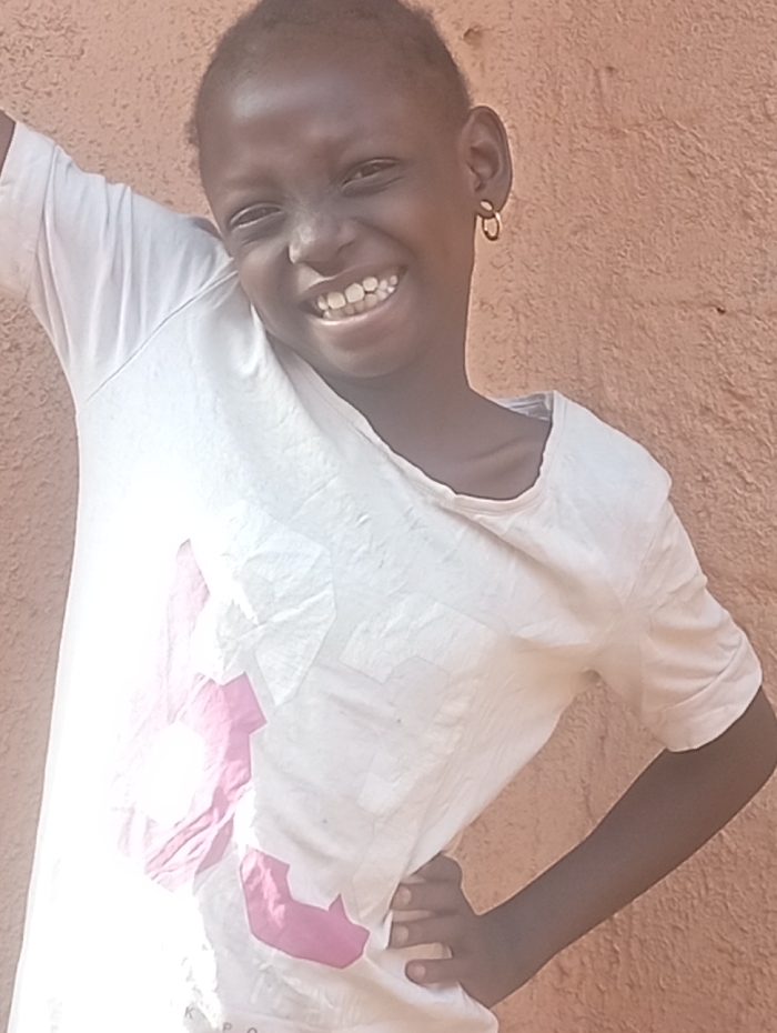 A young, dark-skinned girl smiles broadly at the camera, her teeth visible