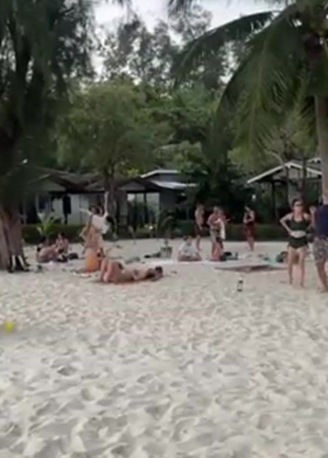 beach with a group of people enjoying various activities. Several individuals are seen sunbathing on the sand, while others are engaged in what appears to be a yoga session. One person is elevated in a pose, possibly supported by another. A man is seen holding a baby. The environment includes trees providing shade, with buildings visible in the background, suggesting a resort or residential area. The beach has light-colored sand. The overall atmosphere seems relaxed and vacation-oriented.