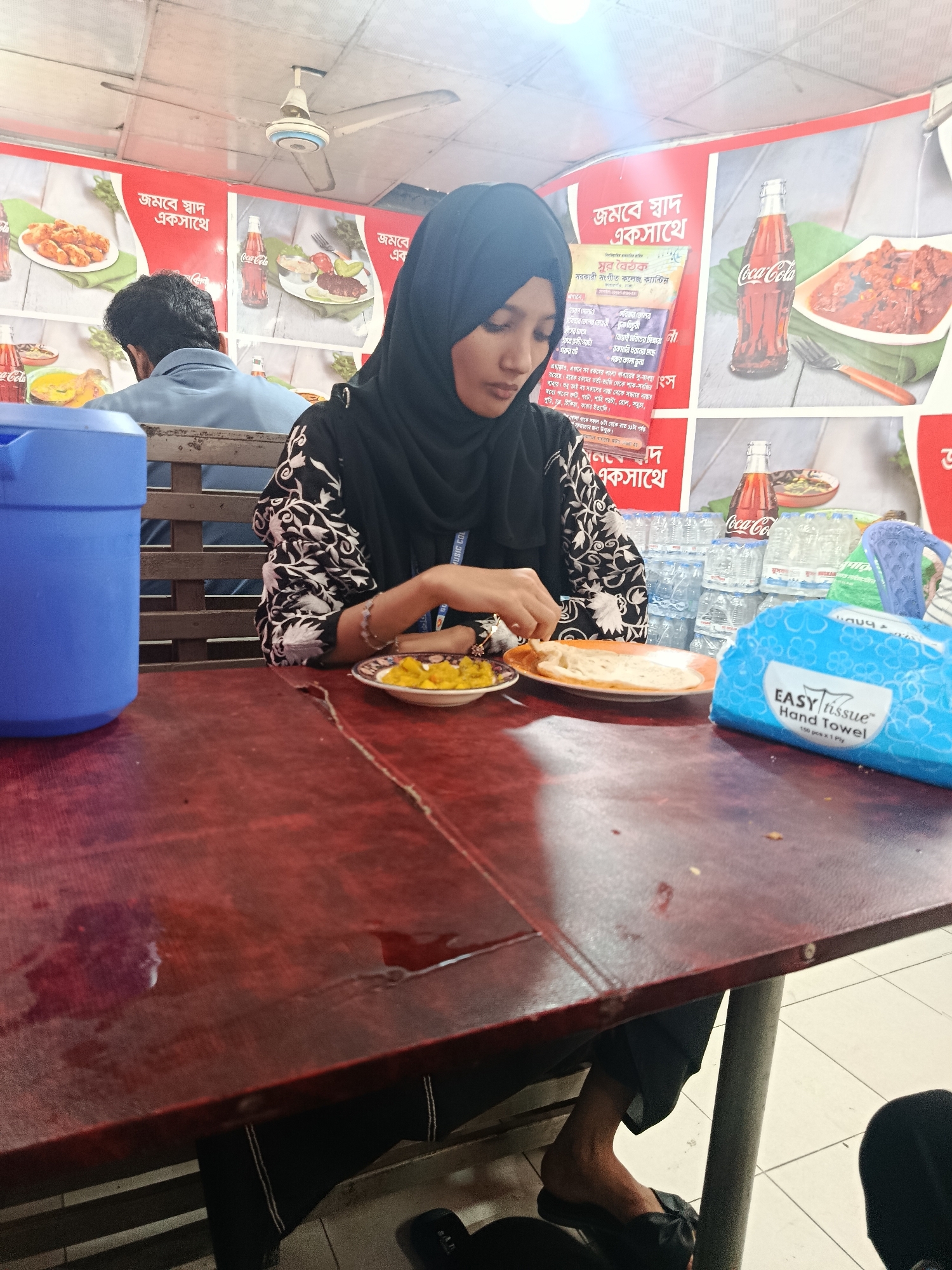 A young woman wearing a hijab and a patterned top is seated at a red-topped table in what appears to be a canteen or restaurant in Dhaka, Bangladesh. She is eating from two plates, one containing what appears to be potatoes and another containing flatbread. In the background, there is a man in a blue shirt, and posters advertising Coca-Cola and food items are visible. A blue container of water and a blue package of Easy Tissue Hand Towels are also on the table. The posters are written in Bengali, and some text mentions "সুর বৈঠক সরকারী সংগীত কলেজ, ক্যান্টিন" which suggests the location is the canteen of the Government Music College. There is a ceiling fan above.