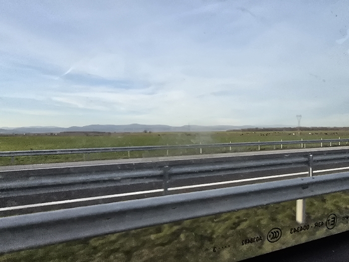 The image displays a rural highway scene in Sarnevo, Bulgaria, observed from a low angle, likely from a moving vehicle. In the foreground, a prominent metallic guardrail runs diagonally across the lower third of the frame, showing faint reflections and surface marks. Inscriptions such as "SRABCOA," "CACAO - REA," and "E3" are visible on its side. Immediately behind this guardrail, a section of dark asphalt road is visible, marked by a single white solid line. Further back, a second, parallel metallic guardrail separates the highway from an expansive green field. Within this field, a scattered group of dark-colored animals, consistent with cattle, are present. On the right side of the midground, a tall, metal lattice electricity pylon rises from the field. The distant background features a range of low, rolling hills or mountains stretching across the horizon. The sky above is light blue with scattered, wispy white clouds, and a distinct, elongated cloud formation is visible in the upper left quadrant. No human figures are present in the scene.