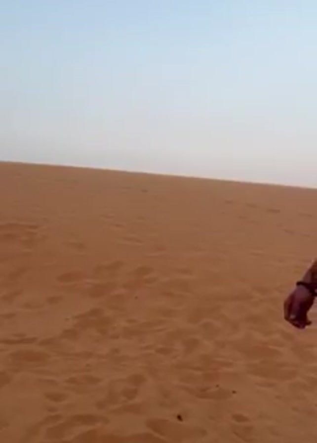 A couple is on a sand dune in the desert. The man has no shirt on, and is wearing jean shorts. The woman is wearing a brown bikini top and brown pants with a scarf tied around her waist. The man lifts the woman and carries her around a little bit. They kiss several times.