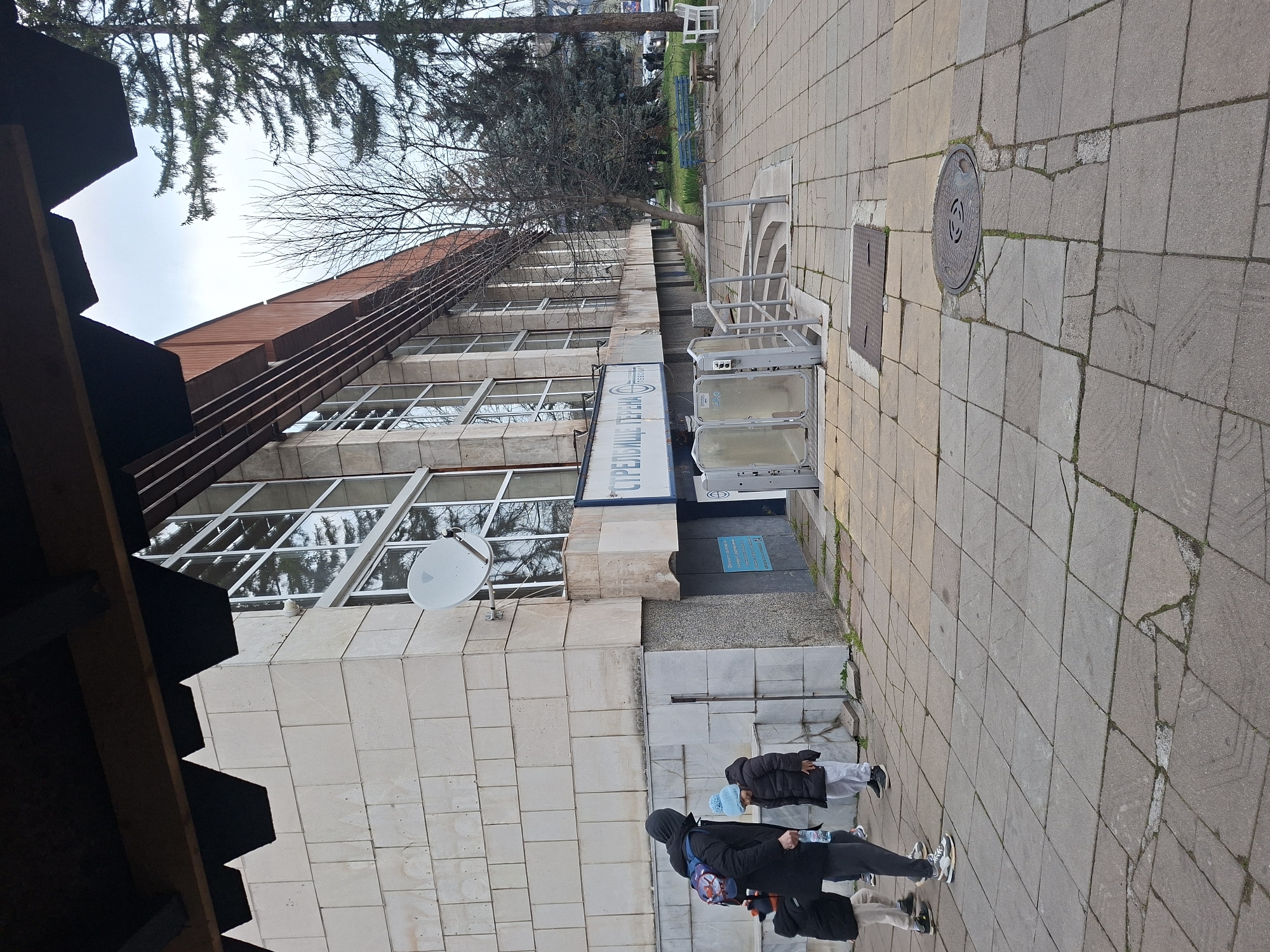 street scene in Sofia, Bulgaria. In the foreground, people are walking along a paved sidewalk. To the left, there is a multi-story building with a beige facade and a distinctive roofline. The building has large windows and a satellite dish mounted on its exterior. A sign on the building reads "СРЕДЊА ТЕХНИЧКА". There is a metal access ramp adjacent to the building. In the background, trees and other vegetation can be seen. A manhole cover is visible in the sidewalk.
