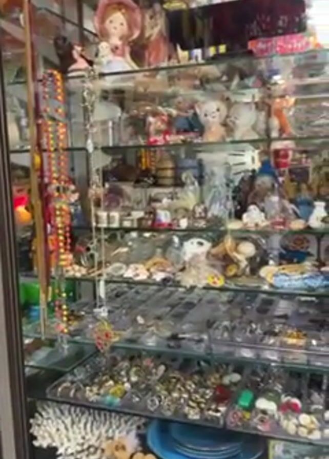 glass display cabinet filled with a variety of items, including jewelry, figurines, and other decorative objects. The cabinet has multiple shelves, and the items are arranged in a cluttered manner. The camera moves slightly, providing different views of the objects inside the cabinet. Some of the objects visible include necklaces, rings, ceramic figurines, small plates, and a decorative camel. The background includes hints of a possibly busy or crowded environment. There are audible human voices, possibly a conversation, in the background.