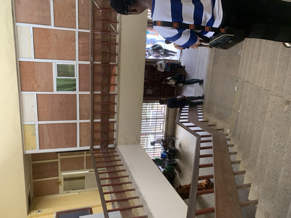 This image captures the interior of a multi-level building in Calabar, Nigeria, likely an institutional or public facility, viewed from an upper staircase looking down