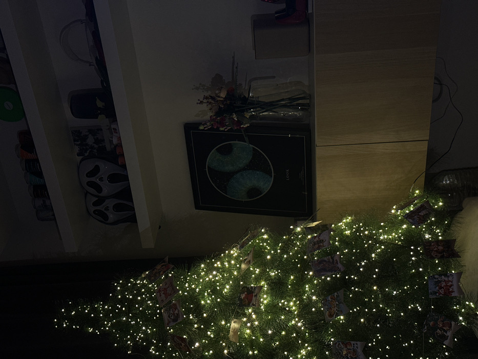 A low-lit interior shows a Christmas tree with many lights and small ornaments. Next to it is a light wood cabinet with a picture on the wall above. The picture is of two blue eye-like shapes. A vase of flowers sits atop the framed picture. A shelf unit is seen in the lower left corner with objects on the shelves. Halloween masks are visible on one of the shelves.