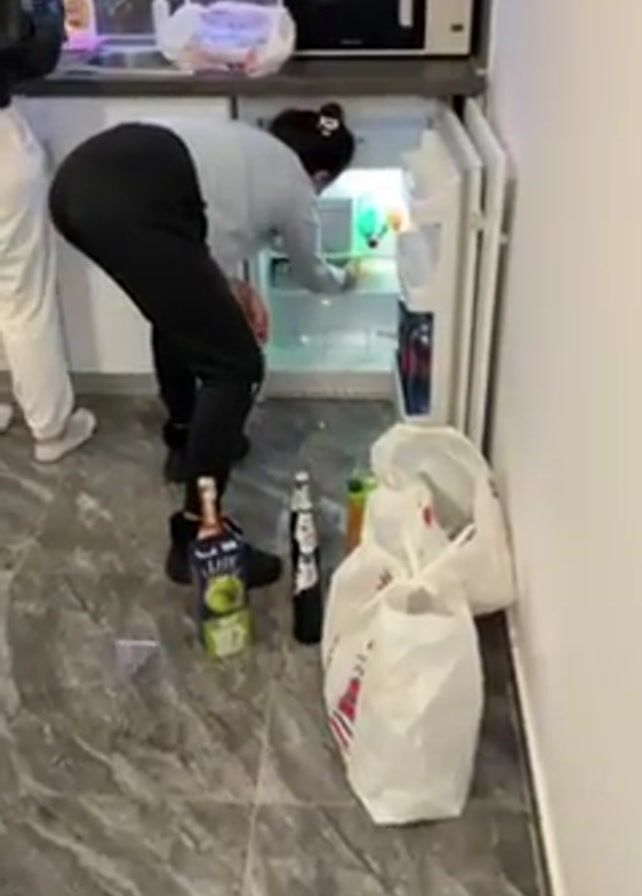 two women in a kitchen putting groceries away into a refrigerator. The refrigerator is small and stocked with items. There are bottles and bags on the floor near the refrigerator. The kitchen has grey marble flooring and white cabinets with a microwave on the counter. The camera pans to show a wooden table with brown paper bags on it. The camera pans again to show a room with a jacuzzi. The room has grey marble flooring, white walls with a wall design, and white lounge chairs.