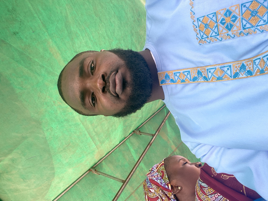 The image depicts two individuals under a green tarp canopy supported by metal framing, located in Hotoro North, Nigeria