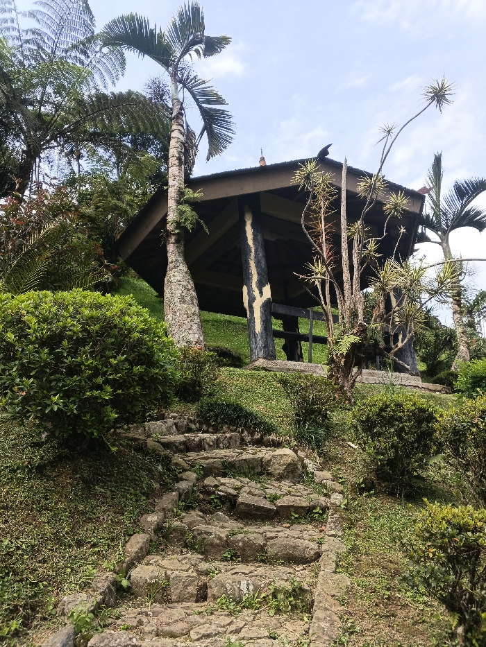 The image displays a daytime outdoor scene in Tamghas, Nepal, featuring a multi-sided wooden pavilion on a grassy slope. A stone staircase, constructed from irregular blocks and partially overgrown with vegetation, ascends from the lower left foreground towards the center-right. Dense green shrubs border the left side of the staircase and are interspersed across the grassy terrain. The pavilion possesses a dark, multi-faceted roof and is supported by thick, upright pillars, some exhibiting distinct black and lighter striped patterns. A tall palm tree with a light-colored trunk and ferns attached grows immediately to the left of the pavilion. Another palm tree is visible on the far right. In front of the pavilion, to the right, a multi-stemmed plant with sparse, spiky leaf clusters is present. A dark bird is perched on the highest point of the pavilion's roof. The background consists of dense green foliage, including large fern-like plants, beneath a sky with scattered white clouds. No human subjects are visible.