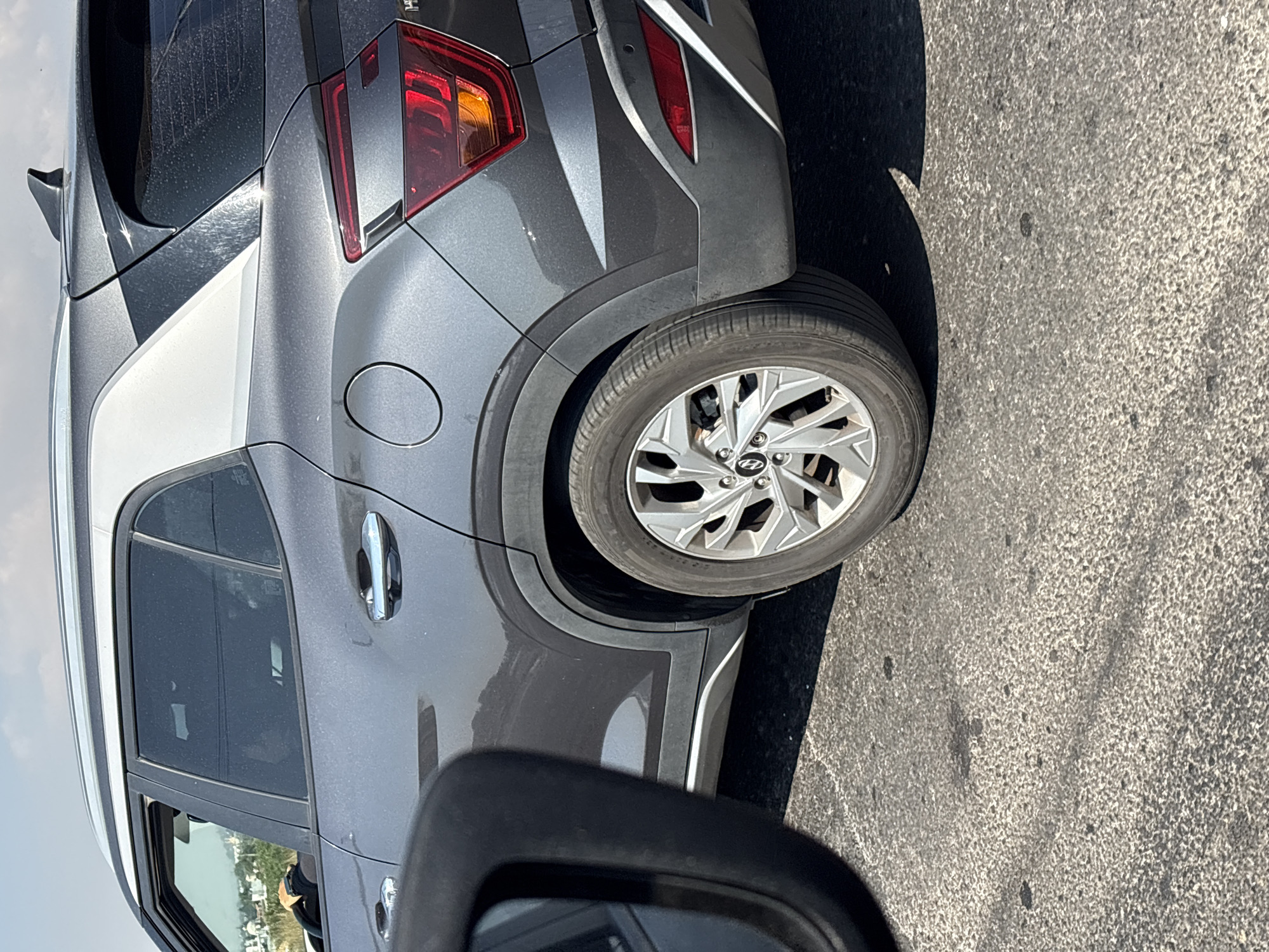 The image presents the passenger side of a dark grey Hyundai Creta SUV, captured from an adjacent vehicle's perspective on an asphalt road in Barrio de Nuevo León, Mexico. The SUV is either stationary or moving slowly under bright daylight conditions. Its metallic finish is complemented by white/silver trim on the C-pillar and roof rails. The rear passenger-side wheel, a silver multi-spoke alloy with a Hyundai emblem, is visible. The circular fuel cap is located above the rear wheel arch. The taillight assembly, containing red and amber light elements, is partially discernible. The vehicle's exterior exhibits a layer of dust, and minor abrasions are present on the rear quarter panel. Through the tinted front passenger window, a portion of a person's right arm and head are visible, presumed to be the driver. A blurred silhouette of a person is discernible in the rear passenger compartment. A segment of a black vehicle side mirror occupies the left foreground. The ground consists of cracked, dark asphalt. The background displays a hazy urban landscape with indistinct low-rise buildings, green foliage, and overhead power lines beneath a partly cloudy sky.